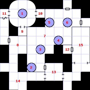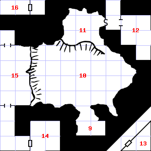 | 16 | A slight breeze blows through this area. There is a slimy coating on the floor here. | 17 | The air here is very hot. There is a mold growing here. Treasure: 300sp, 60gp. | 18 | Fog gathers and swirls on the floor, concealing it. |