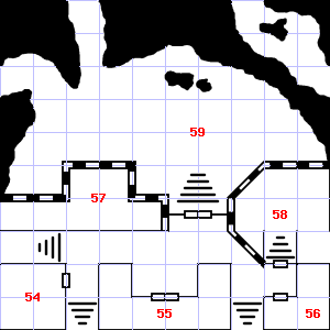 | 55 | Treasure: 100sp, 60gp. | 56 | The ceiling here is damp. Treasure: 400sp, 50gp. | 57 | This area is very dusty. Encounter: Spiders, Crab (3) Treasure: None. |
