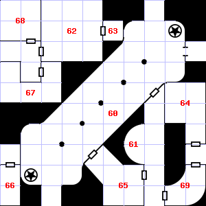| 64 | The air here is very cold. This area is covered in cobwebs. Encounter: Halflings (8) Treasure: None. | 65 | There is a large puddle of water here. | 66 | Encounter: Gnomes (2) Treasure: None. |