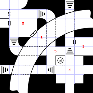 | 52 | A haze of smoke hangs in the air. There is a broken sword blade here. Encounter: Green Slimes (4) Treasure: As per monster type. | 53 | There is a broken arrow here. Treasure: 300sp. | 54 | Encounter: Dwarves (2) Treasure: As per monster type. |