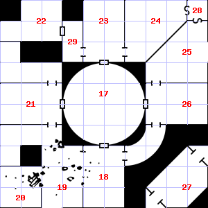 | 28 | A gusting breeze blows through this area. This area smells faintly of urine. Treasure: 300sp. | 29 | The air here is very hot. A haze of smoke hangs in the air. | 30 | There is a bent and rusted iron bar here. Encounter: Spiders, Crab (4) Treasure: As per monster type. |