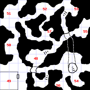 | 43 | There is a small puddle of water here. | 44 | It is foggy here, making it difficult to see. Treasure: 500sp. | 45 | |
