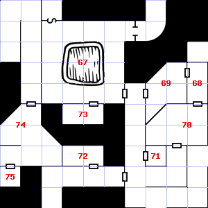 | 67 | This area has a stale, fetid smell. There is a torch stub here. Encounter: Sprites (8) Treasure: As per monster type. | 68 | A strong, gusting wind blows through this area. | 69 | There is a large puddle of water here. Encounter: Green Slimes (2) Treasure: None. |