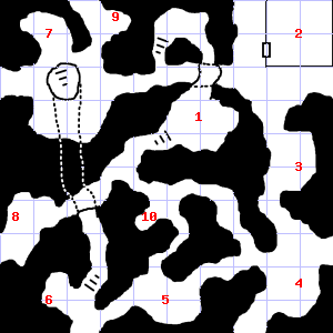 | 25 | A strong wind blows through this area. Treasure: 200sp, 30gp. | 26 | Trap: 10' Pit: 1d6 points of damage if you fall in. | 27 | This area has a pleasant, earthy smell. Treasure: 200sp, 10gp. Trap: Flash of light: Save vs. Spells or be blinded for 1d8 turns (1d8x10 minutes). |