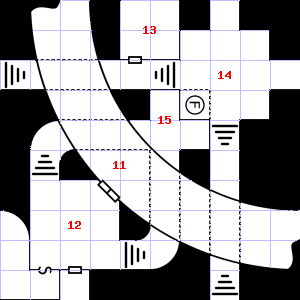 | 13 | 14 | The air here is very hot. Treasure: 500sp. Trap: Flash of light: Save vs. Spells or be blinded for 1d8 turns (1d8x10 minutes). | 15 | There is a torn sack here. | |