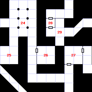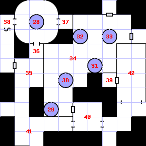 | 31 | This area is covered in cobwebs. Treasure: 100sp. Trap: Spring-fired darts: 1-6 darts hit for 1-4 points of damage each. | 32 | A slight, damp breeze blows through this area. | 33 | A slight breeze blows through this area. |