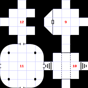 | 10 | Treasure: 200sp. | 11 | There is a pile of dung here. | 12 | There are several small stones here. Treasure: 500sp, 60gp. |