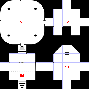 | 49 | There is a slimy coating on the wall here. Treasure: 300sp, 30gp. | 50 | This area has a pleasant, earthy smell. It is foggy here, making it difficult to see. | 51 | This area smells faintly of manure. This area is covered in rubble and dirt. |