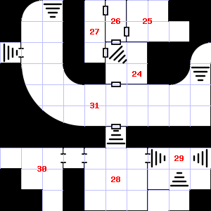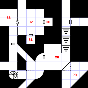 | 28 | A cold air current blows through this area. This area has a stale, fetid smell. It is foggy here, making it difficult to see. There is a pile of ashes here. | 29 | This area smells of rotting vegetation. Treasure: 100sp, 10gp. | 30 | A strong updraft blows through this area. There is a mold growing here. |