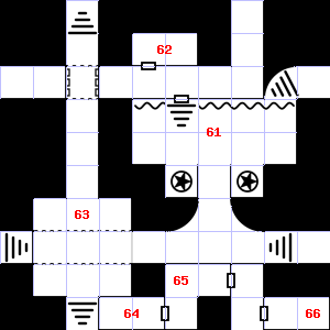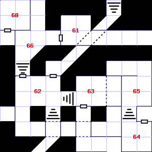| 64 | A strong, moaning wind blows through this area. This area smells of rotting vegetation. | 65 | There are bones scattered here. Treasure: 200sp. Trap: Spring-fired darts: 1-6 darts hit for 1-4 points of damage each. | 66 | |