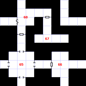 | 67 | The air here is very hot. An acrid smell assails your nostrils. There is a mold growing here. Encounter: Spiders, Crab (3) Treasure: None. | 68 | A strong, gusting wind blows through this area. This area smells faintly of manure. Encounter: Shrews, Giant (9) Treasure: None. | 69 | This area is covered in cobwebs. |