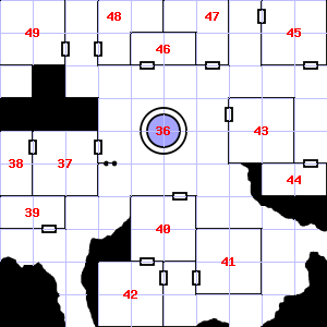 | 46 | A slight, damp breeze blows through this area. It is foggy here, making it difficult to see. There is a large puddle of water here. Trap: 10' Pit: 1d6 points of damage if you fall in. | 47 | 48 | There is a trickle of water here. Encounter: Traders (5) Treasure: None. | |