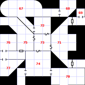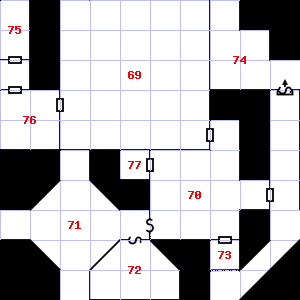 | 70 | A haze of smoke hangs in the air. There is a slimy coating on the ceiling here. Encounter: Traders (2) Treasure: As per monster type. | 71 | This area has a stale, fetid smell. This area is covered in cobwebs. Trap: Poison gas: Save vs. Poison or die. | 72 | This area smells faintly of urine. The wall here is damp. Encounter: Spiders, Crab (1) Treasure: None. |