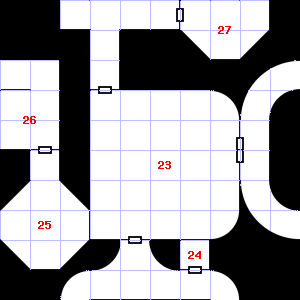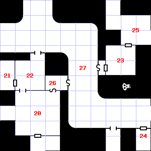 | 25 | A chlorine-like smell assails your nostrils. | 26 | This area is very dusty. Encounter: Skeletons (9) Treasure: None. | 27 | Treasure: 600sp, 30gp. Trap: Poison snake: 1 hit dice. |