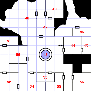 | 43 | There is a broken pole here. | 44 | There is a broken pole here. Encounter: Kobolds (9) Treasure: As per monster type. | 45 | A haze of smoke hangs in the air. The wall here is damp. |