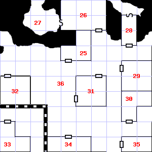 | 31 | A strong, moaning wind blows through this area. Encounter: Orcs (6) Treasure: None. | 32 | Treasure: 100sp. | 33 | This area smells faintly of urine. Encounter: Green Slimes (3) Treasure: As per monster type. |