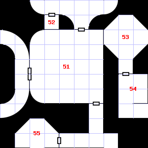 | 49 | A slight, damp breeze blows through this area. There is a pile of dung here. Encounter: Snakes, Cobra (6) Treasure: As per monster type. | 50 | This area has a pleasant, earthy smell. This area is covered in cobwebs. | 51 | |