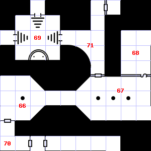 | 67 | This area smells faintly of urine. There are rotting wood pieces here. Encounter: Acolytes (1) Treasure: None. | 68 | Treasure: 600sp, 10gp. | 69 | Your nostrils are overwhelmed by a sulphurous smell. Guano covers this area. |