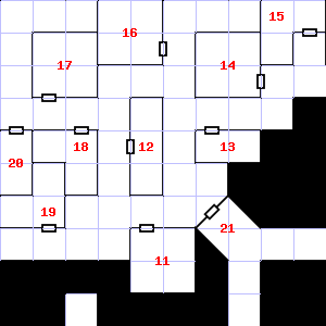 | 13 | The ceiling here is damp. Encounter: Sprites (5) Treasure: As per monster type. | 14 | 15 | There is a mold growing here. | |