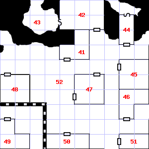 | 46 | There is a corroded chain here. Encounter: Goblins (6) Treasure: As per monster type. | 47 | There is a bent and rusted iron bar here. | 48 | A slight breeze blows through this area. |