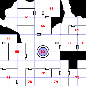 | 61 | There is a broken pole here. Treasure: 600sp. Trap: Poison needle: Save vs. Poison or die. | 62 | Treasure: 500sp. | 63 | The air here is very hot. Fog gathers and swirls on the floor, concealing it. There is a bent copper coin lying here. Encounter: Acolytes (1) Treasure: None. |