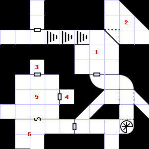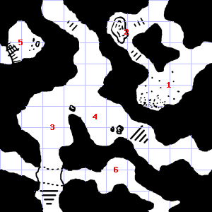 | 1 | The air here is very hot. The smell of ozone assails your nostrils. It is foggy here, making it difficult to see. There is a mold growing here. Encounter: Dwarves (5) Treasure: As per monster type. | 2 | A slight breeze blows through this area. The ceiling here is damp. Encounter: Kobolds (7) Treasure: None. | 3 | The wall here is damp. Encounter: Dwarves (5) Treasure: None. |