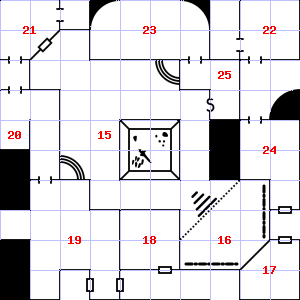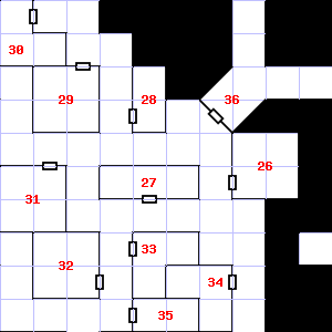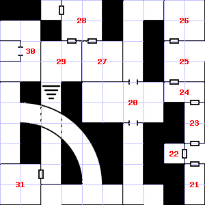 | 25 | A gusting breeze blows through this area. Treasure: 400sp, 30gp. | 26 | Trap: Poison gas: Save vs. Poison or die. | 27 | A cold air current blows through this area. A haze of smoke hangs in the air. |