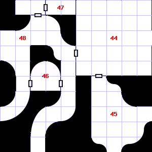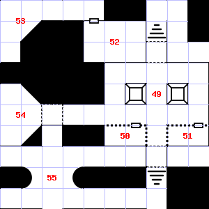 | 52 | This area has a stale, fetid smell. Treasure: 100sp, 10gp. Trap: Illusion of monsters: Green Slimes (2) | 53 | This area is covered in cobwebs. Encounter: Acolytes (6) Treasure: As per monster type. | 54 | Encounter: Goblins (6) Treasure: None. |