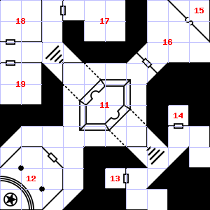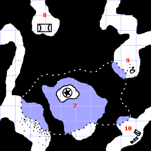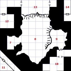 | 7 | 8 | This area is covered in cobwebs. | 9 | Treasure: 100sp, 20gp. | |
