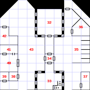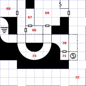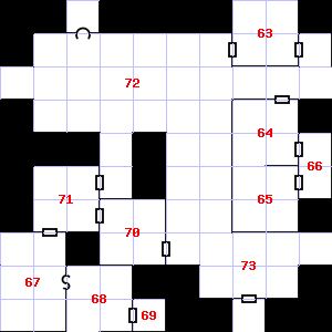 | 70 | 71 | Fog gathers and swirls on the floor, concealing it. | 72 | A slight downdraft blows through this area. This area smells faintly of manure. There are rotting wood pieces here. Treasure: 600sp. | |