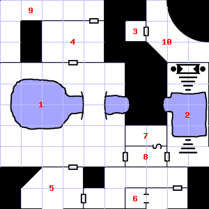 | 7 | The air here is very hot. It is foggy here, making it difficult to see. There is a pile of straw here. Encounter: Lizards, Gecko (1) Treasure: None. | 8 | This area smells faintly of manure. There is a small puddle of water here. Encounter: Beetles, Fire (1) Treasure: None. | 9 | A metallic smell assails your nostrils. There are cracks in the floor here. |