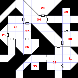 | 28 | Fog gathers and swirls on the floor, concealing it. The ceiling here is damp. Trap: 10' Pit: 1d6 points of damage if you fall in. | 29 | 30 | A strong, moaning wind blows through this area. Encounter: Traders (8) Treasure: None. | |