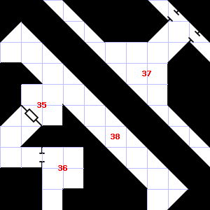 | 34 | The air here is very hot. There is a salty, wet smell to this area. This area is covered in cobwebs. | 35 | This area has a pleasant, earthy smell. Encounter: Killer Bees (4) Treasure: As per monster type. | 36 | There is a broken sword blade here. |