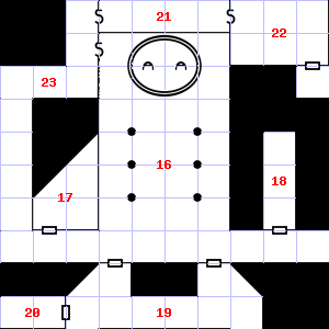 | 16 | This area is covered in cobwebs. Treasure: 200sp. | 17 | Trap: Ceiling Block falls: Save vs. turn to Stone or take 1d10 points of damage. | 18 | Treasure: 200sp. |