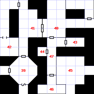 | 40 | This area has a pleasant, earthy smell. There is a broken arrow here. Encounter: Green Slimes (4) Treasure: As per monster type. | 41 | This area has a stale, fetid smell. | 42 | A slight breeze blows through this area. Encounter: Spiders, Crab (4) Treasure: As per monster type. |