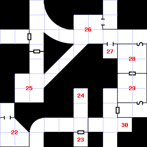 | 25 | Encounter: Wolves (12) Treasure: None. | 26 | There is a slimy coating on the wall here. | 27 | This area is covered in rubble and dirt. |
