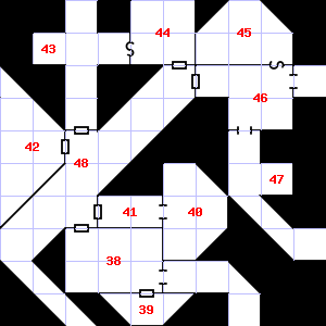 | 40 | A slight, damp breeze blows through this area. This area smells of rotting vegetation. | 41 | There is water dripping here. Treasure: 300sp. Trap: Spray: Unknown liquid that attracts Wandering Monsters; double chances for 1d6 hours. | 42 | |
