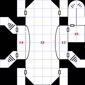 | 13 | There is a slimy coating on the floor here. Treasure: 100sp. | 14 | It is foggy here, making it difficult to see. This area is covered in cobwebs. | 15 | This area smells faintly of manure. This area is covered in cobwebs. |