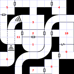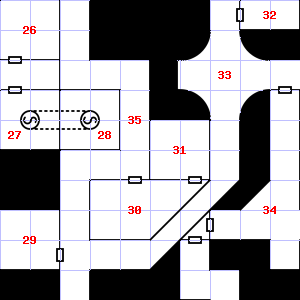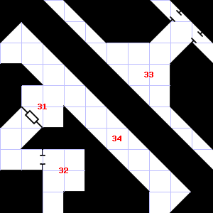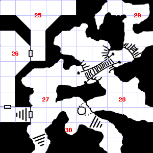 | 28 | This area has a pleasant, earthy smell. Trap: Fog: Looks like poison gas, but harmless. | 29 | Fog gathers and swirls on the floor, concealing it. This area is covered in cobwebs. Encounter: Acolytes (6) Treasure: None. | 30 | The air here smells of smoke. The wall here is damp. Treasure: 600sp, 10gp. |