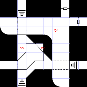| 55 | Encounter: Spiders, Crab (4) Treasure: None. | 56 | A metallic smell assails your nostrils. There is a pile of dung here. | 57 | This area has a stale, fetid smell. This area is very dusty. |