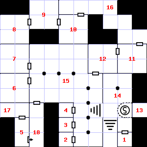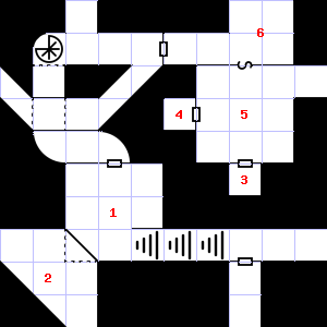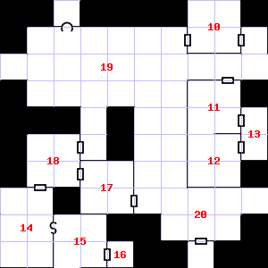 | 7 | The ceiling here is damp. Encounter: Green Slimes (2) Treasure: None. | 8 | 9 | The remnants of a rope are here, rotten. Treasure: 500sp, 5 gems. | |