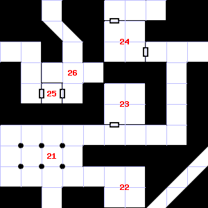 | 22 | The air here is very hot. | 23 | The air here is very hot. There is a trickle of water here. | 24 | The air here is very cold. Encounter: Green Slimes (1) Treasure: As per monster type. |