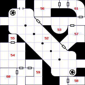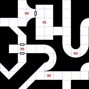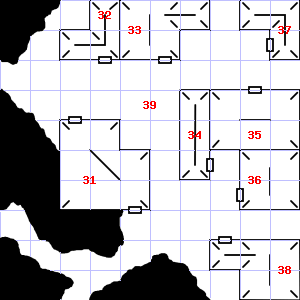 | 34 | This area smells faintly of manure. The hilt of a broken dagger is lying here. Trap: Pendulum blade from ceiling: 1d8 points of damage. | 35 | 36 | This area smells of rotting vegetation. There is a large puddle of water here. Trap: Pendulum blade from ceiling: 1d8 points of damage. | |