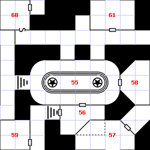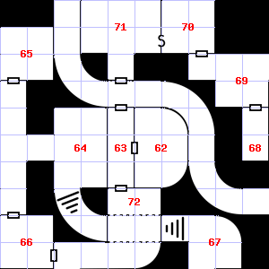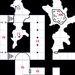 | 70 | A strong wind blows through this area. Fog gathers and swirls on the floor, concealing it. | 71 | A strong updraft blows through this area. There is water dripping here. | 72 | A chlorine-like smell assails your nostrils. This area is covered in cobwebs. |