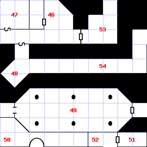 | 46 | A haze of smoke hangs in the air. | 47 | It is foggy here, making it difficult to see. There are cracks in the ceiling here. Treasure: 400sp, 50gp. Trap: Poison snake: 1 hit dice. | 48 | There are dry leaves and twigs scattered here. Treasure: 400sp, 40gp. |