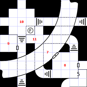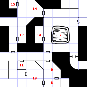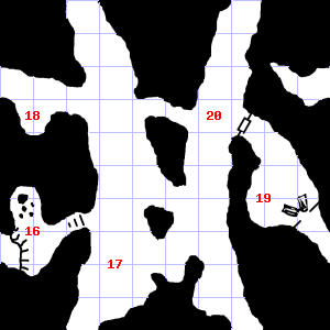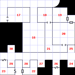 | 16 | A slight breeze blows through this area. There is a torn sack here. Encounter: Wolves (9) Treasure: None. | 17 | Encounter: Skeletons (8) Treasure: None. | 18 | Fog gathers and swirls on the floor, concealing it. There is water dripping here. Trap: Chute: No damage, but slide to the next level down (ignore if there is no lower level). |