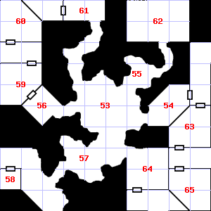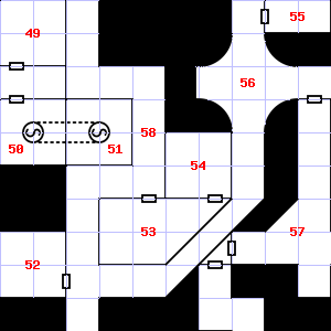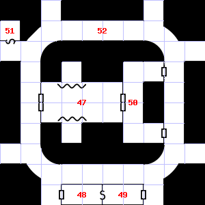 | 49 | Fog gathers and swirls on the floor, concealing it. There are bones scattered here. Treasure: 500sp. | 50 | It is misty here. This area is covered in cobwebs. Treasure: 400sp. | 51 | Treasure: 100sp. Trap: Poison snake: 1 hit dice. |