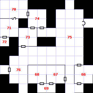 | 64 | There is a bent copper coin lying here. | 65 | A strong updraft blows through this area. | 66 | A slight downdraft blows through this area. The smell of ozone assails your nostrils. There is a pile of straw here. Encounter: Skeletons (5) Treasure: None. |