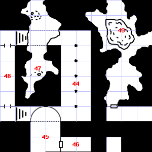 | 43 | A haze of dust hangs in the air. There is a pile of dung here. Encounter: Lizards, Gecko (2) Treasure: As per monster type. | 44 | It is misty here. There is a broken bottle here. | 45 | |