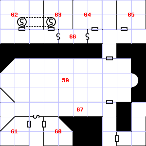 | 58 | 59 | It is foggy here, making it difficult to see. Treasure: 600sp. | 60 | It is foggy here, making it difficult to see. There are bits of fur and hair scattered around here. | |